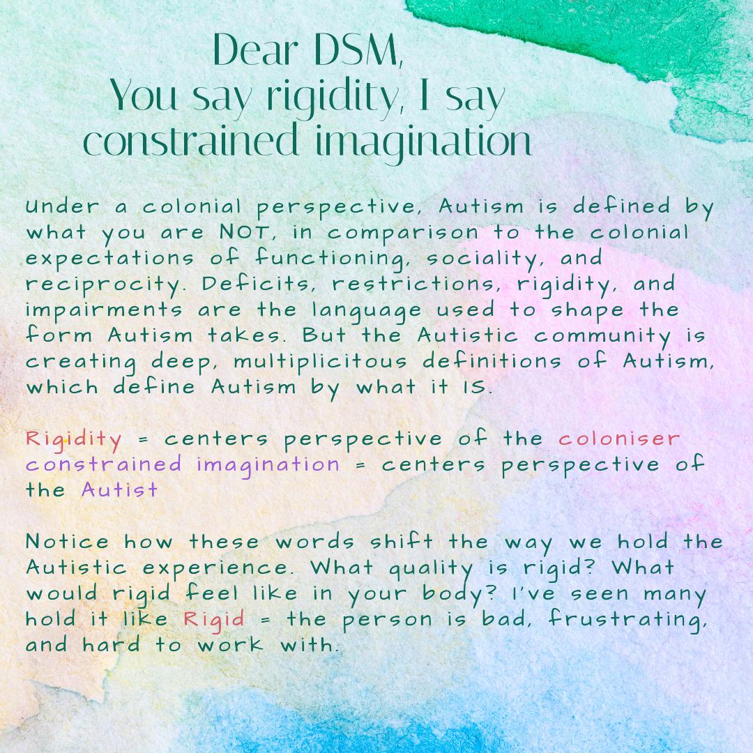 The DSM, the manual used to diagnose Autism and other mental health experiences, is a colonial tool. In what we call the USA, therapists are expected to use the DSM to pathologise people with mental health disorders. In reality, our mental health is a much more complicated and dynamic state of being — it is the intersection of environment, body, brain, spirit, and emotion. More often than not, it is our environment that is disordered, that created dis-order in us, and the process of healing is unlearning the internalised and inherited disorder of colonialism. That being said, the DSM has colonised so many human experiences, Autism being just one of them. Autism is this big messy splay of colours, and the DSM zooms in on one of the colours, and says all of Autism is this one tiny piece.